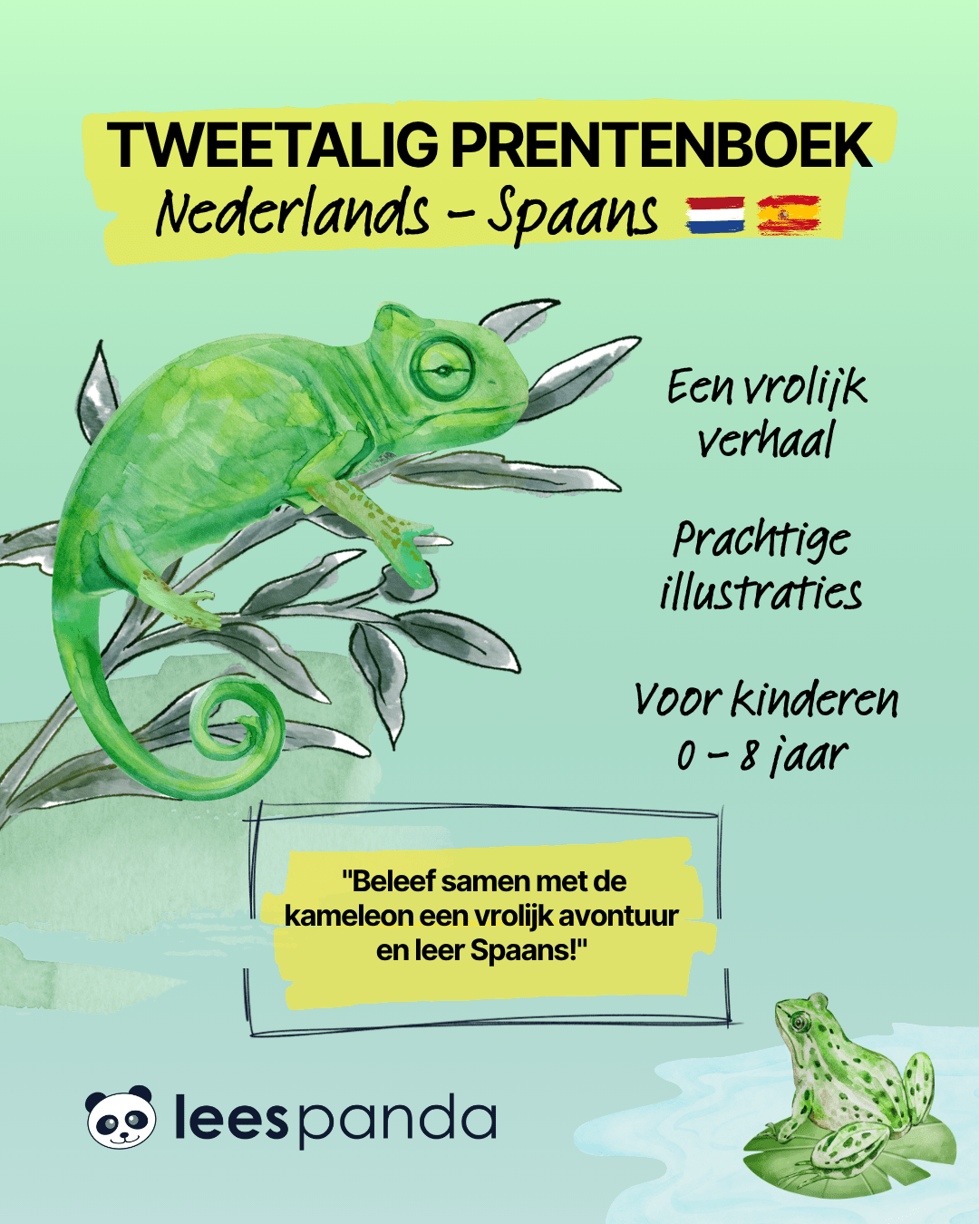 ✨ Descubre este libro ilustrado bilingüe (holandés – español) sobre un camaleón que cambia de color.